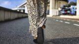 花柄スカートと黒いバレエシューズの足元
