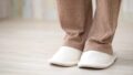チェック柄コートとスラックスを着た人物の屋外での足元